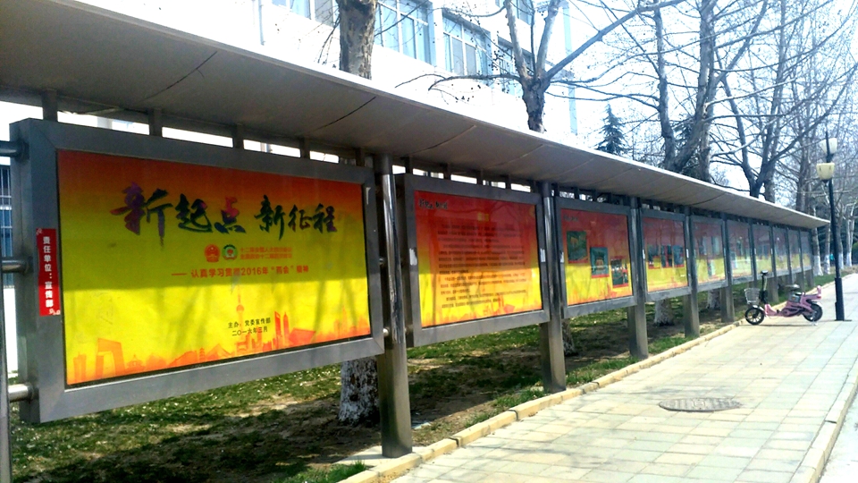 3月24日,学校在东校区慧智楼、西校区博雅楼前宣传栏同时举办“新起点 新征程——认真学习贯彻2016年‘两会’精神”专题展览。