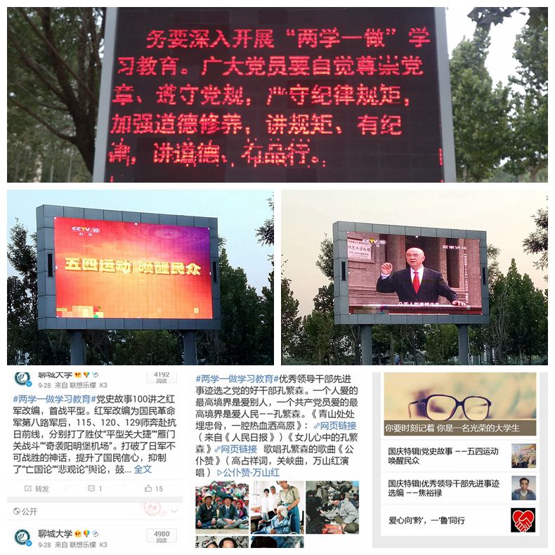 近日,学校充分利用、发挥电子显示屏、官方微博、微信等新兴宣传阵地的优势,发布“两学一做”学习教育宣传标语,推送焦裕禄、孔繁森等党的优秀领导干部的先进事迹,播放党史故事专题片,营造“两学一做”学习教育的良好氛围。